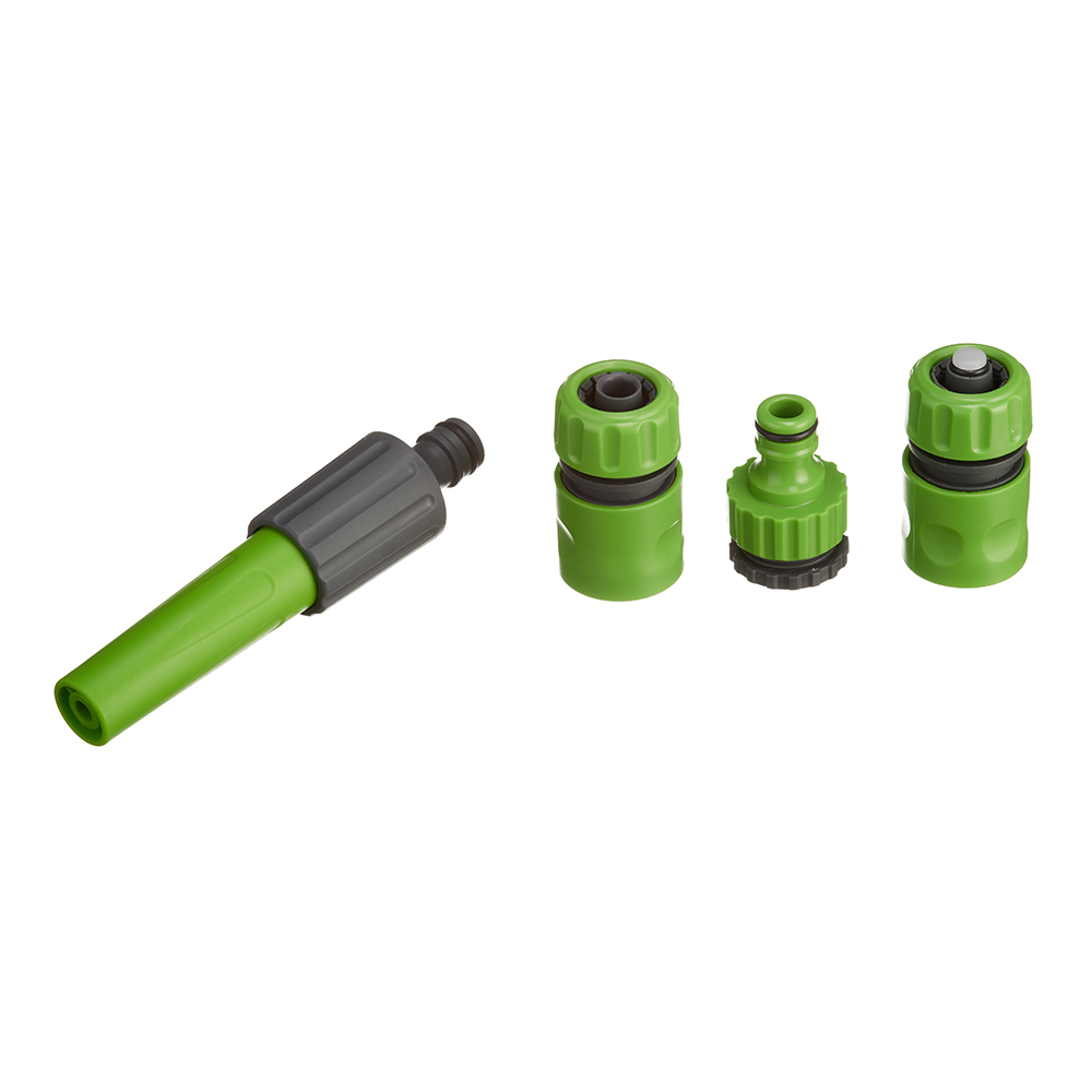Комплект для полива. Набор из 4 предметов. Пистолет, коннектор сквозной, коннектор с аквастопом, коннектор на кран. Насадка для полива — 2 режима. Коннектор 1/2″ — 2 шт. Штуцер 1/2″- 3/4″ — 1 шт.