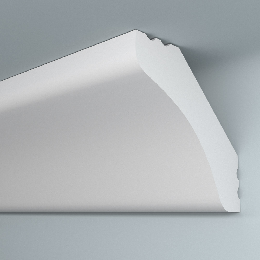 Предназначен для внутренней декоративной отделки жилых помещений. Классическая модель плинтуса имеет высокую плотность, гладкую матовую поверхность. Оптимальная плотность потолочного плинтуса обеспечивает однородность структуры, а незначительный вес создает дополнительные удобства при монтаже. Не требует обязательной окраски. Крепится к стене и потолку при помощи шпаклевки или жидких гвоздей.