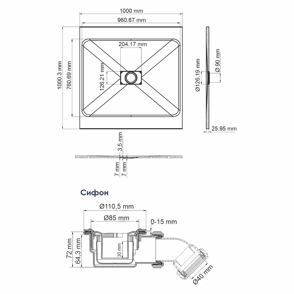 Душевой поддон – 1 шт., заглушка из нержавеющей стали – 1 шт., сифон – 1 шт., заглушка SMC (стеклопластик) – 1 шт.