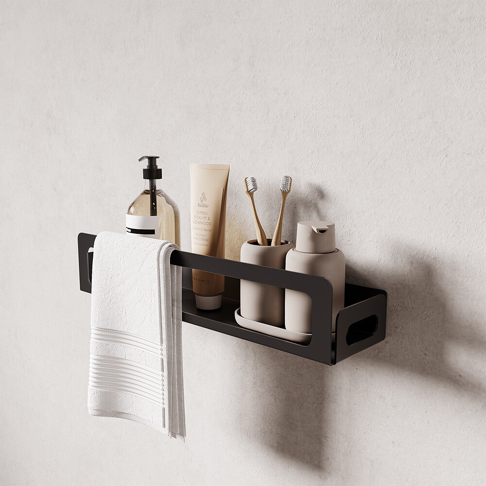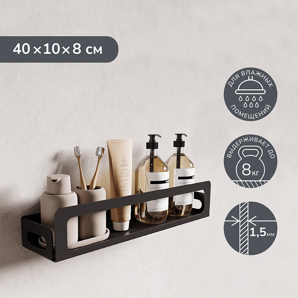Полка изготовлена из металла. Выполнена в черном цвете. Легко и быстро устанавливается благодаря специальным креплениям. Высокий бортик со всех сторон полки защитит любой предмет от падения.