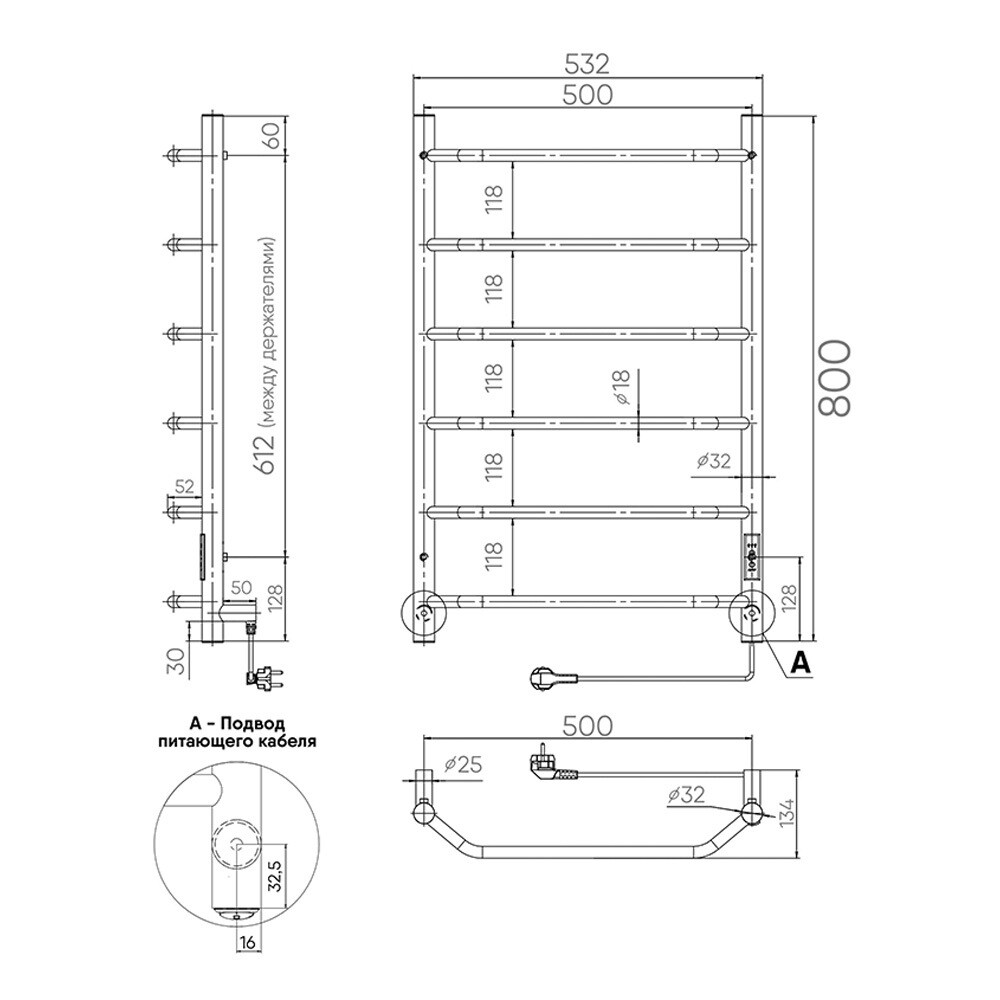 Комплектация: полотенцесушитель, 3 телескопических держателя, комплект для монтажа, гарантийный паспорт.