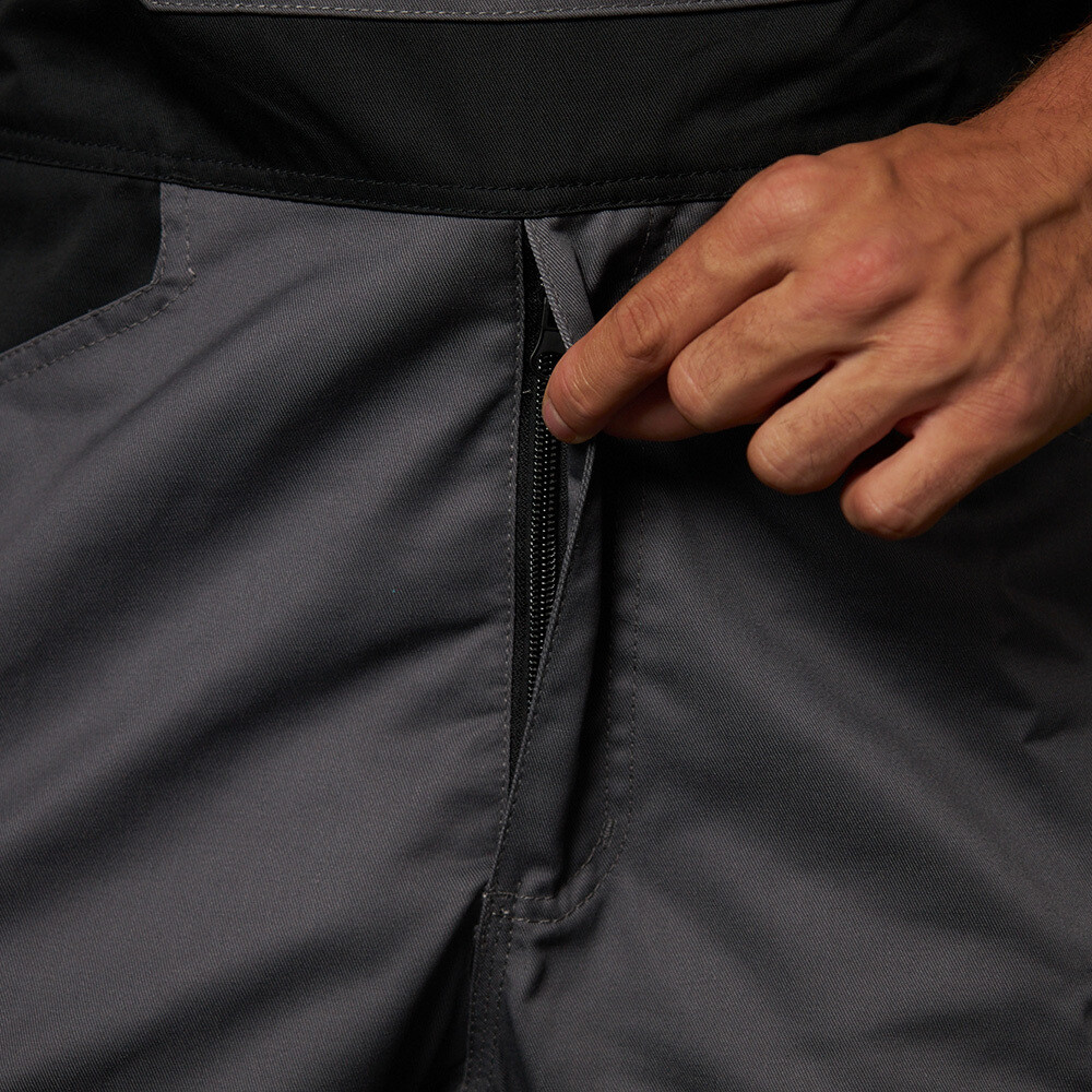 Большое количество накладных и прорезных карманов – 10 карманов, включая один карман для линейки и усилительные накладки в области коленей в виде карманов для наколенников, застегивающихся на контактную ленту сбоку кармана.