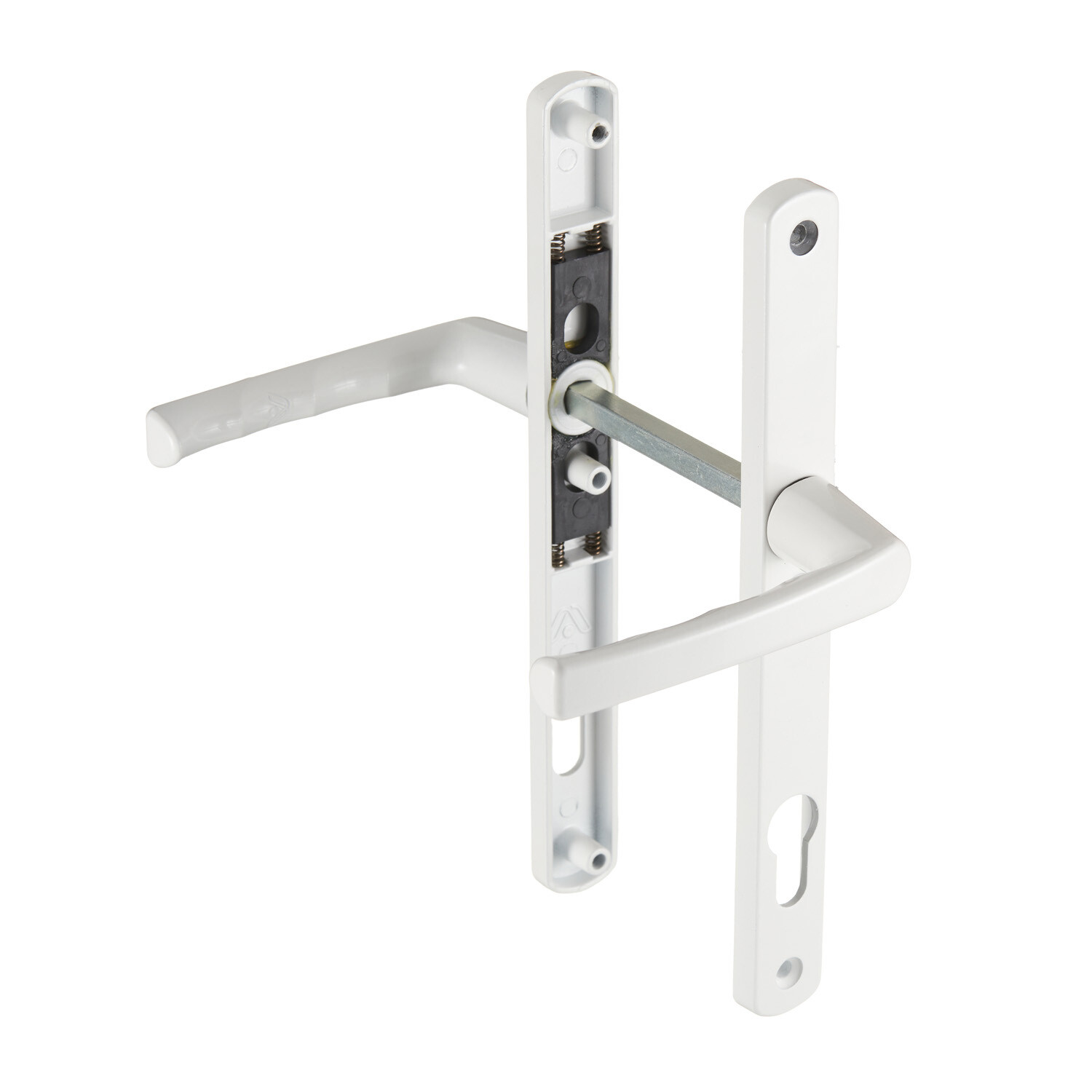 Двухсторонняя ручка (нажимной гарнитур) для металлопластиковых дверей белого цвета. Предназначена для открывания металлопластиковых дверей. Ручка имеет подпружиненный механизм.