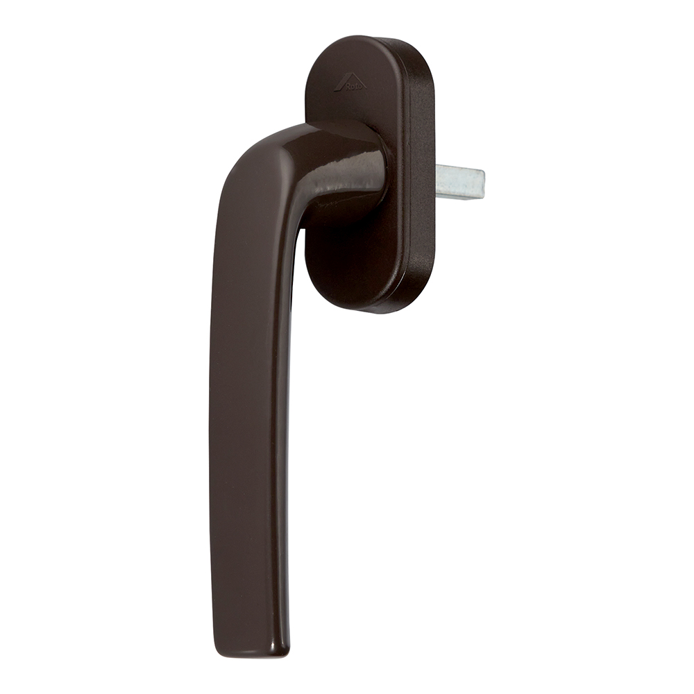 Ручка оконная Roto Samba с логотипом Roto, алюминиевая без ключа, коричневого цвета, штифт 37 мм, угол фиксации 90°, 2 винта в комплекте. Предназначена для окон из дерева и ПВХ.
