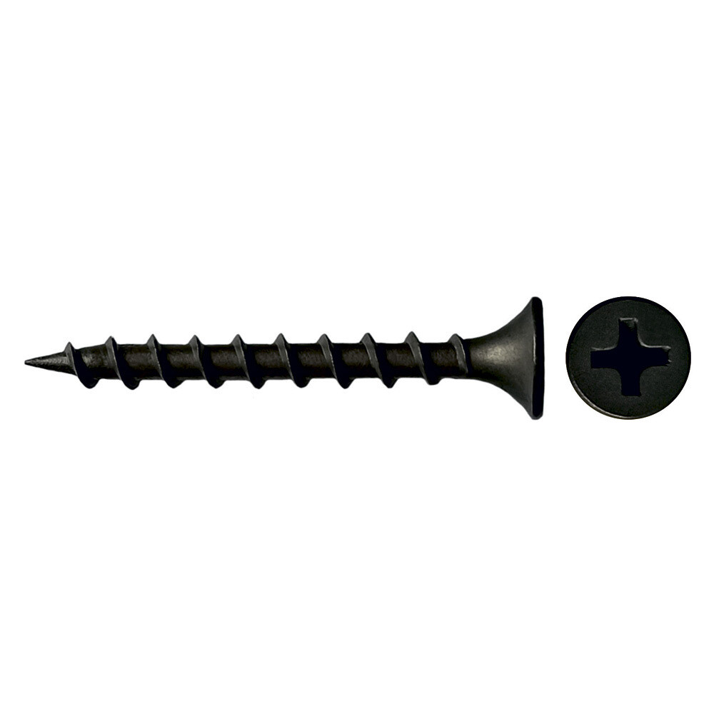 Метиз представляет собой классический остроконечный шуруп с резьбой по всему стержню. Имеет фосфатное покрытие, надежно защищающее от коррозии, плоскую шляпку с крестообразным шлицем Phillips № 2. Подходит для потайного монтажа — может быть утоплен полностью в поверхность скрепляемых материалов.