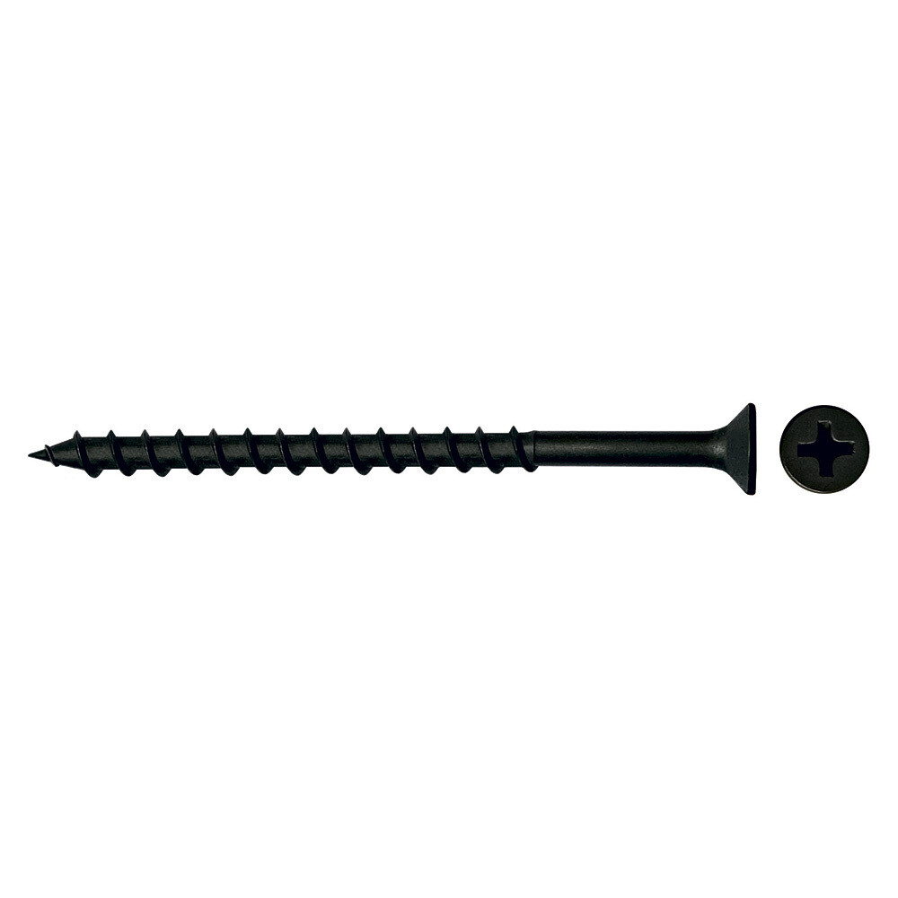 Метиз представляет собой классический остроконечный шуруп с резьбой по всему стержню. Имеет фосфатное покрытие, надежно защищающее от коррозии, плоскую шляпку с крестообразным шлицем Phillips № 2. Подходит для потайного монтажа — может быть утоплен полностью в поверхность скрепляемых материалов.