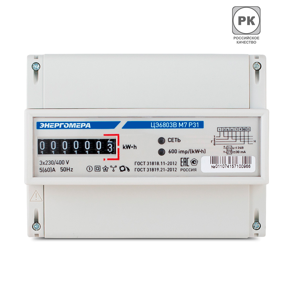Счетчик электроэнергии Энергомера ЦЭ6803В М7 Р31 трехфазный однотарифный электронный 5(60) А на DIN-рейку
