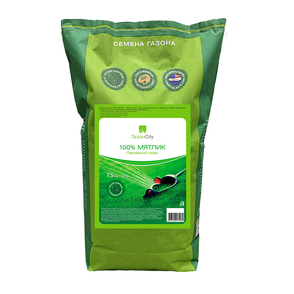 Партерный газон 100% Мятлик — семена газонных трав, предназначенные для создания устойчивых декоративных газонов на участках с повышенными эстетическими требованиями.