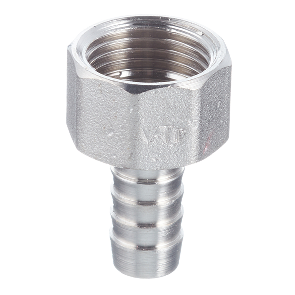 Предназначен для подключения к водозапорной арматуре, непосредственно к трубопроводам поливочного шланга. Изделие можно применять также в других системах с неагрессивной к используемым материалам рабочей средой (горячая вода, незамерзающий теплоноситель, сжатый воздух и т.д.). Фитинг выполнен из сантехнической латуни CW617N, защищенной никелевым гальванопокрытием. Присоединительный патрубок снабжен цилиндрической трубной наружной резьбой с насечками для лучшего удержания герметика. Штуцер для шланга имеет конфигурацию, эффективную для его фиксации. Присоединение шлангов необходимо производить с помощью плоских обжимных хомутов.