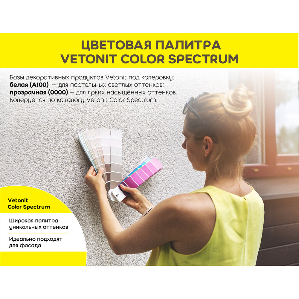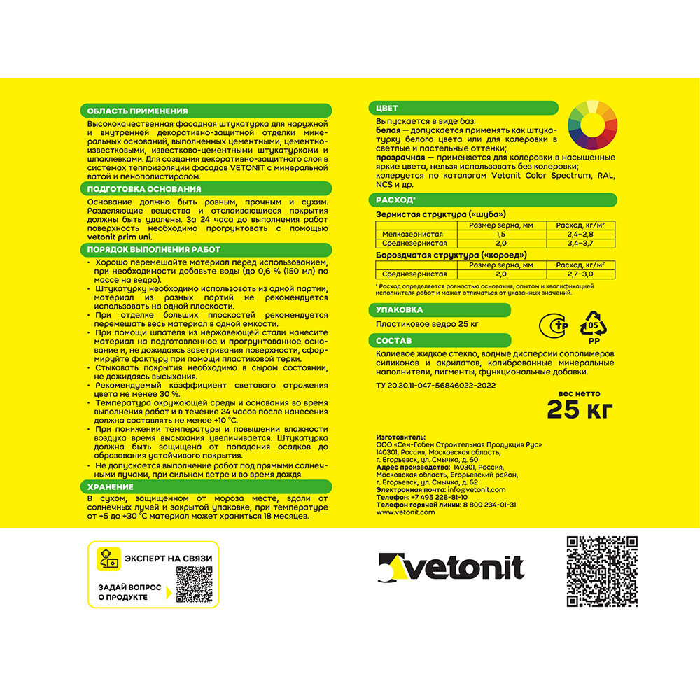 Готовая к применению силикатно-силиконовая полимерная декоративная штукатурка. Подходит для создания декоративно-защитного слоя на поверхности теплоизоляционных фасадных систем. Образует покрытие в виде плотно уложенной каменной крошки. Подходит для внутренних и наружных работ. Долговечная, обладает эффектом самоочищения, высокой стойкостью к образованию грибков и плесени. Легка в работе, подходит для механизированного нанесения. Не требует последующей окраски, так как колеруется в массе. Перед применением необходимо загрунтовать поверхность при помощи Vetonit prim uni.
