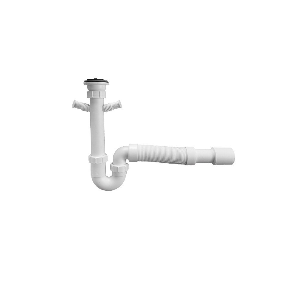 Сифон трубный c выпуском, пробкой, двумя отводами для бытовой техники и отводным раздвижным коленом под 90°.