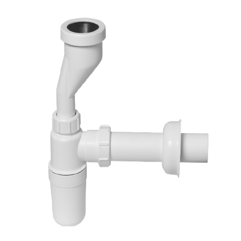 Сифон бутылочный для писсуаров с приемной воронкой со смещением, с отводной трубой и отражателем.
