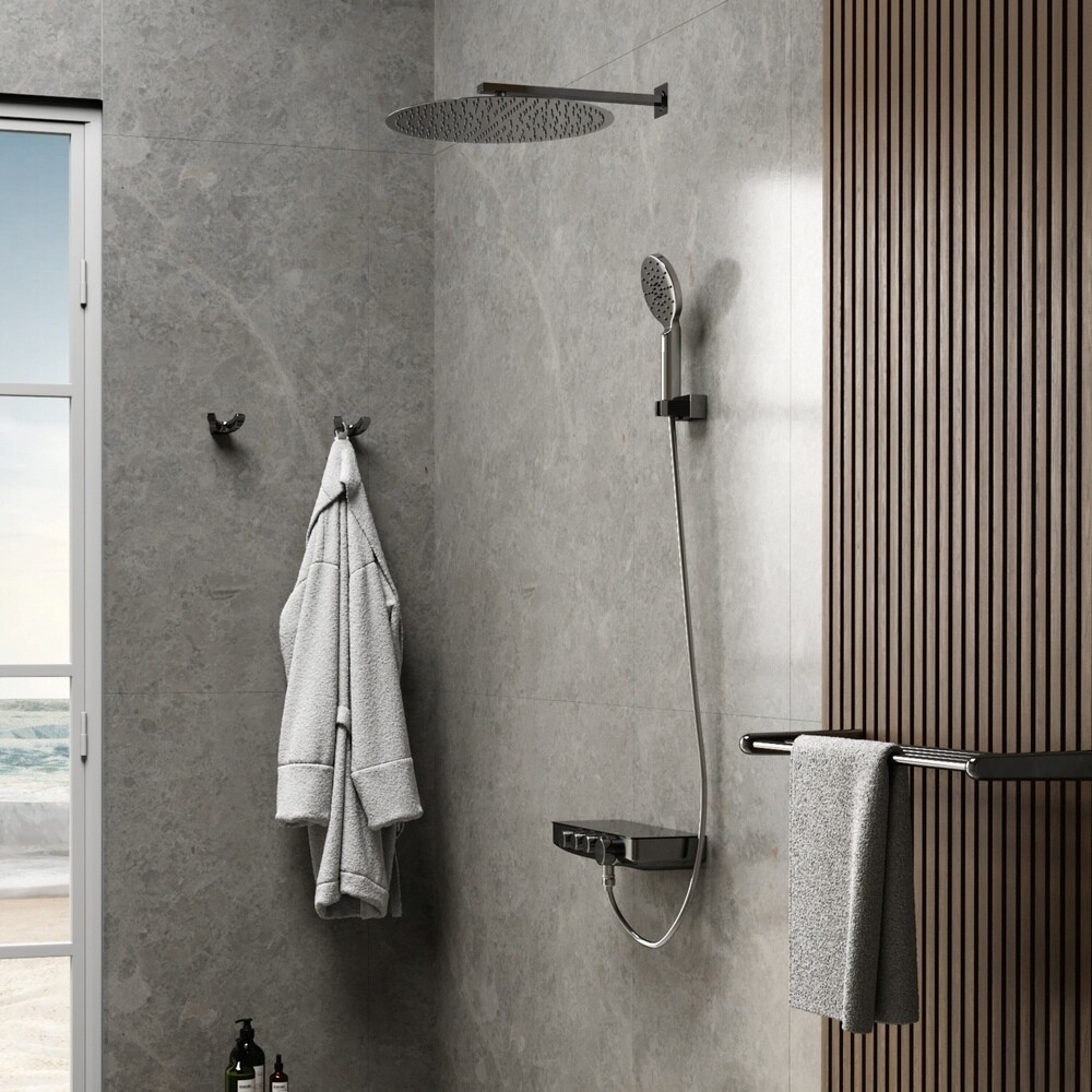 Elbe 7499 Thermo Термостатический смеситель для ванны и душа имеет покрытие Soft-touch. Для создания этого покрытия матового черного или белого цвета, изделия проходят процесс гальванизации. Особый цвет и ощутимая мягкость получаются с помощью нанесения электролитов, в состав которых входит никель. Такое покрытие отличается прочностью, оно легко очищается и, главная его особенность, покрытие бархатистое на ощупь. Функция регулировки потока воды. Смеситель на 3 выхода. Подключается к трем аксессуарам для душа: верхней душевой насадке, лейке для душа и настенному изливу.