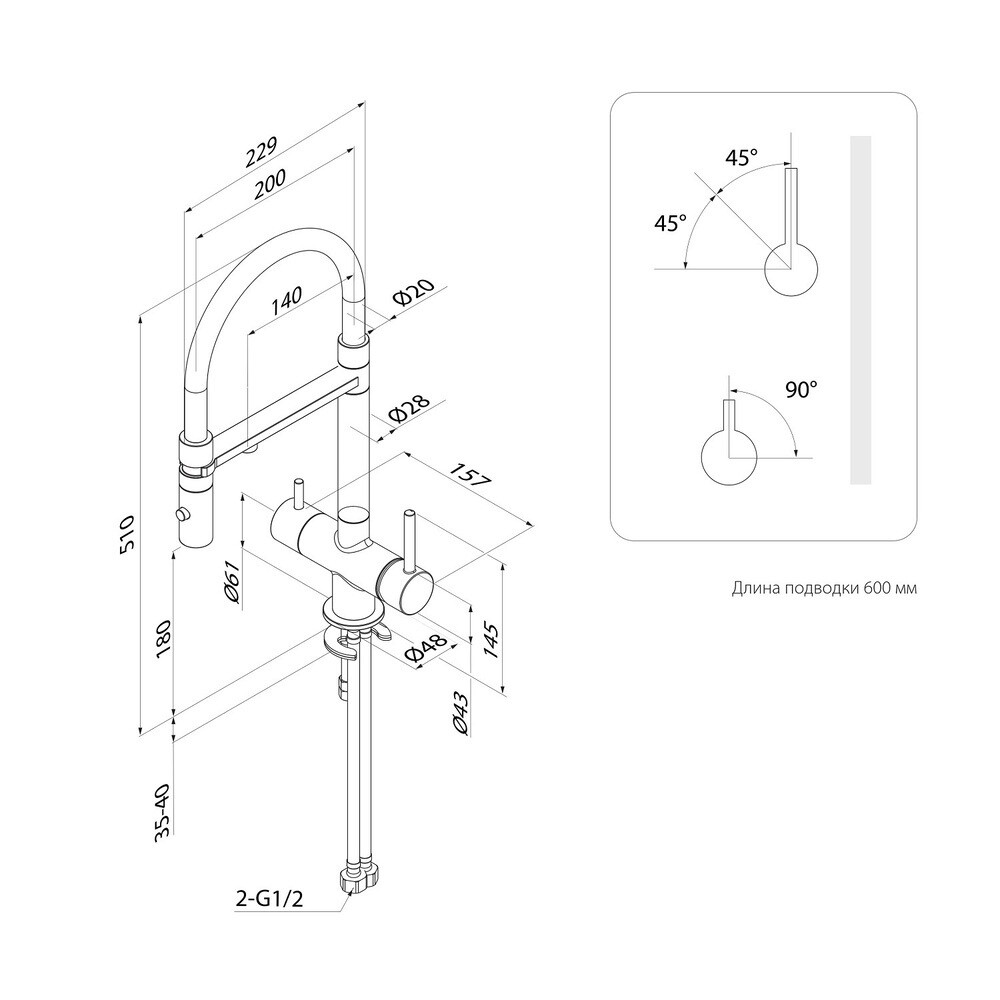 Смеситель – 1 шт., гибкая подводка – 1 шт., комплект крепежа – 1 шт., комплект для подключения ф…