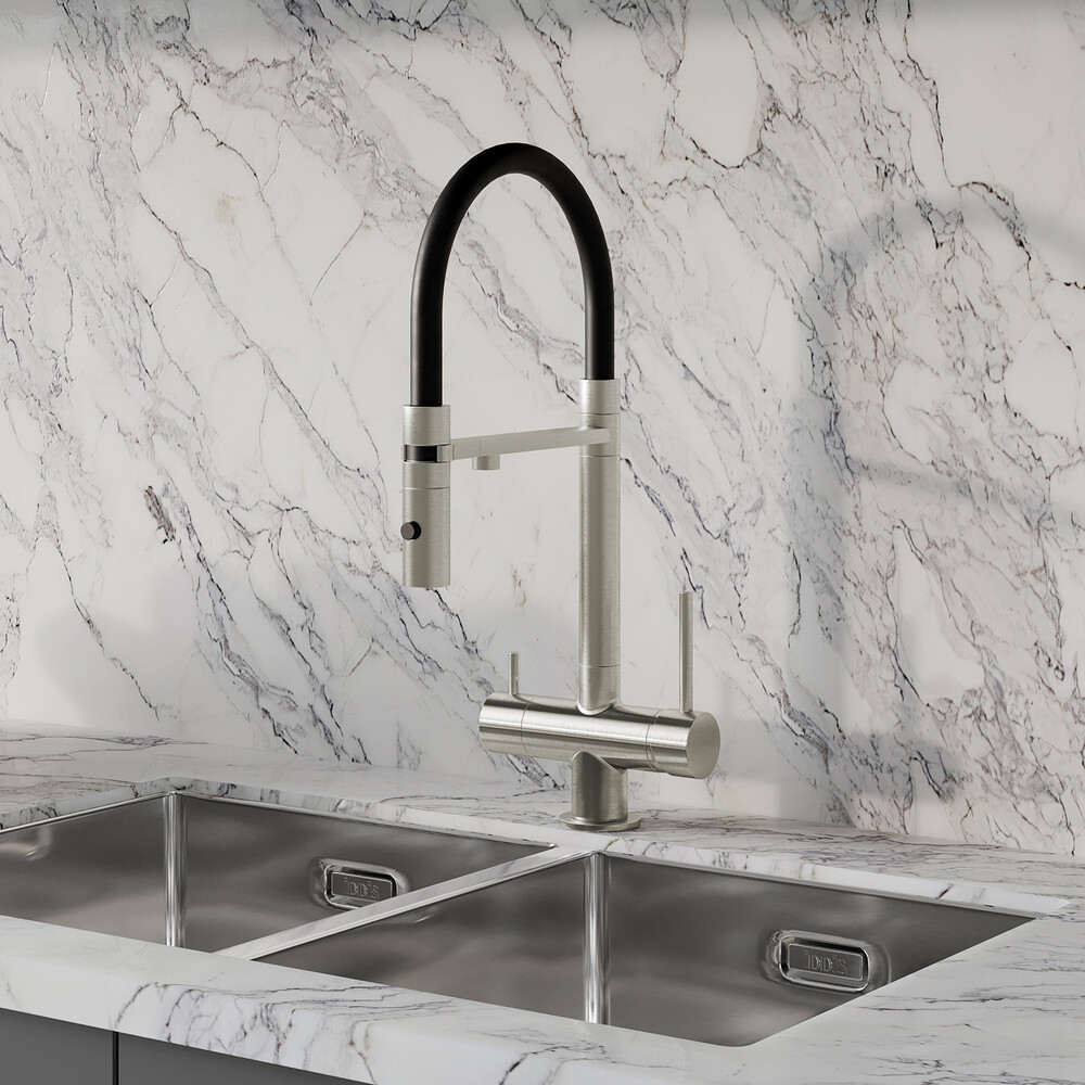 Профессиональный смеситель для кухни Ace в сатиновом оттенке с черным гибким изливом и отдельным каналом для фильтрованной воды. Гибкий излив позволяет направить струю воды в нужную точку.