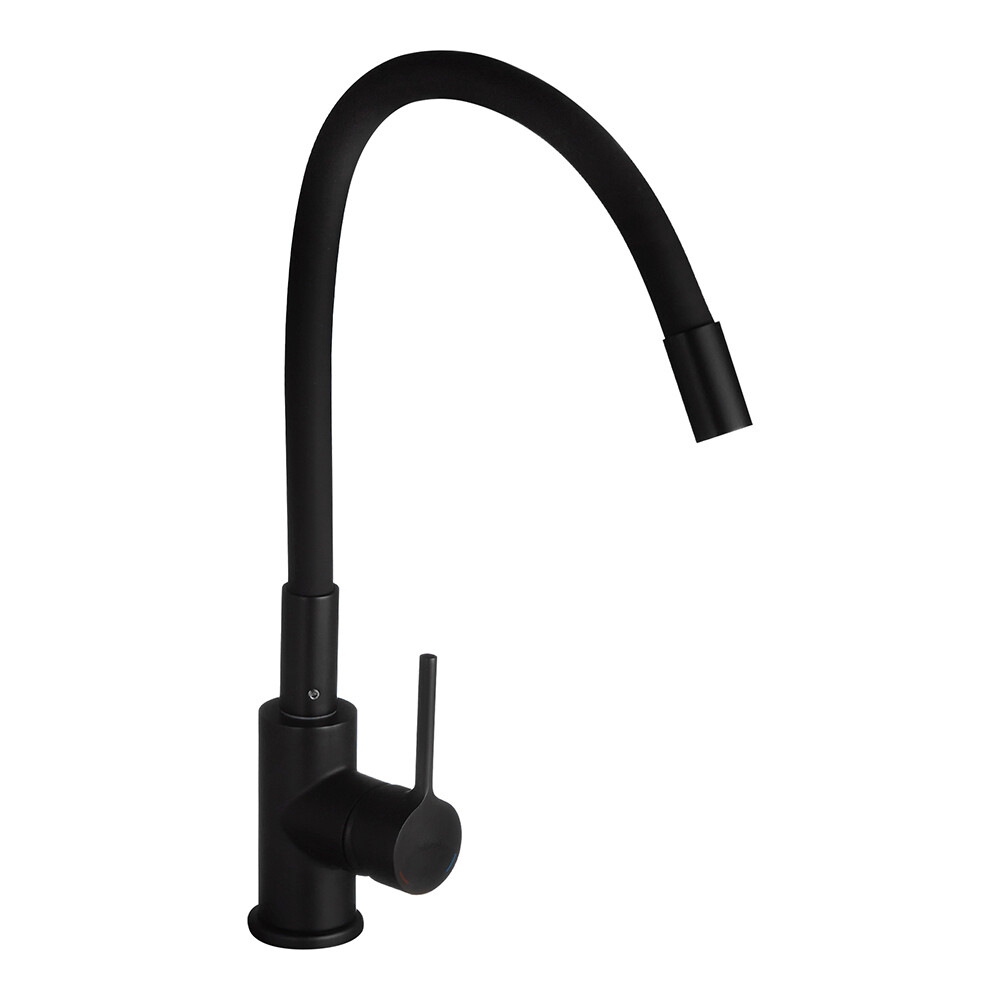 Черный смеситель из цветной коллекции Meal – демократичное решение для современной кухни с высокой функциональностью. Гибкий излив позволяет менять направление потока, расширяя рабочую область смесителя.