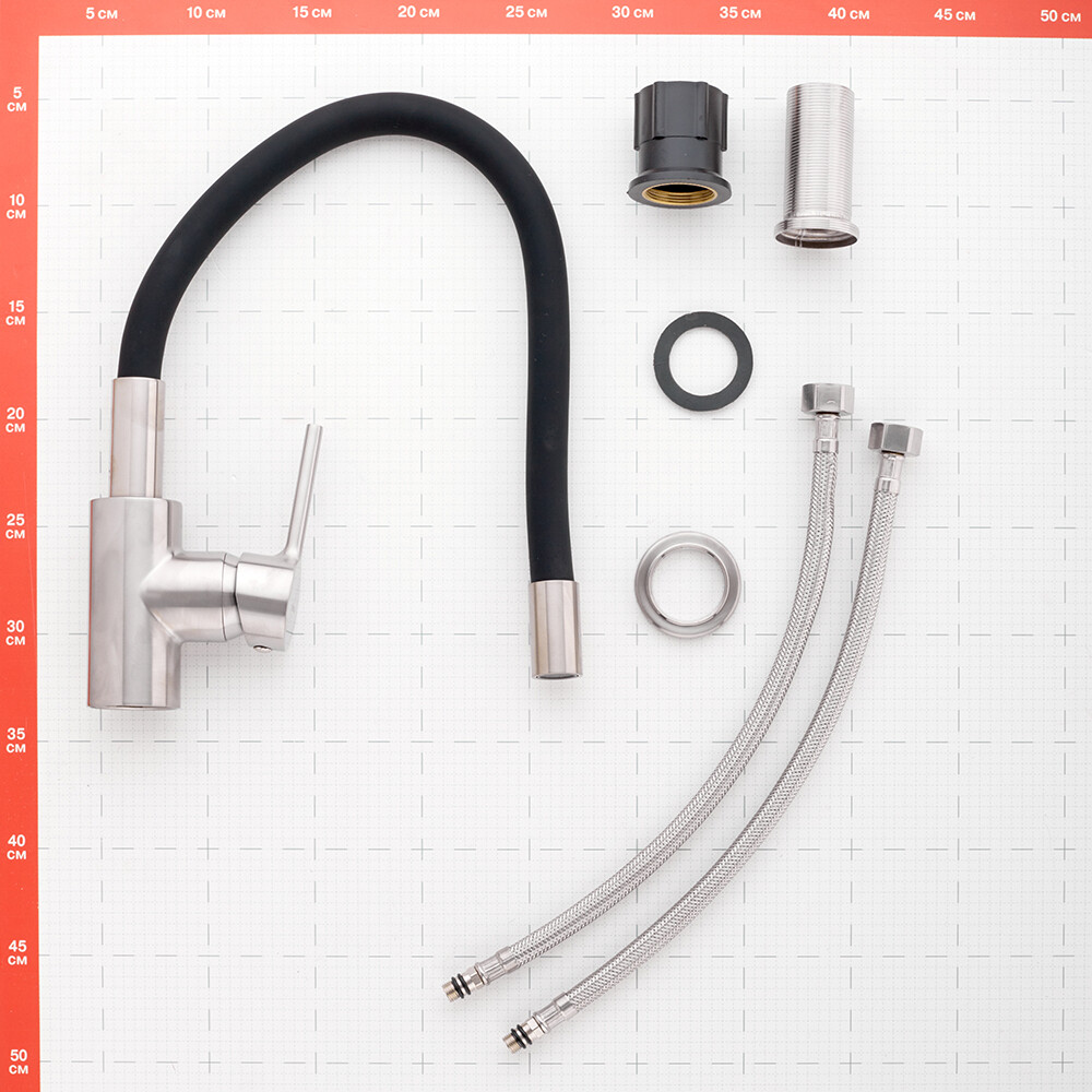 В комплектацию входит: смеситель — 1 шт., гибкая подводка из нетоксичной EPDM резины в оплетке из нержавеющей стали, М10 — 1/2, крепление.