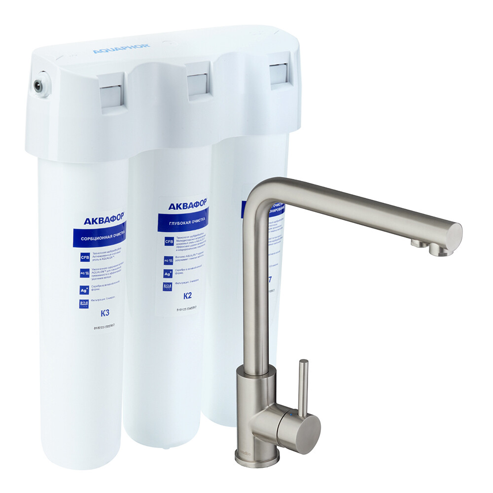 Смеситель для кухни с каналом для фильтрованной воды в комплекте с фильтром Аквафор Кристалл.
