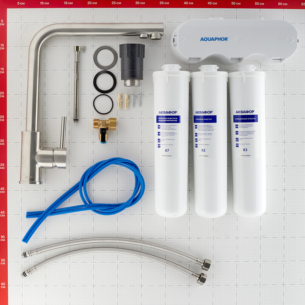 Кухонный смеситель, фильтр, аэратор Neoperl, гибкая подводка SoftPEX, набор креплений, инструкция.