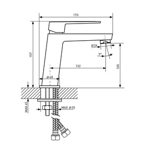 Смеситель в сборе, круглая уплотнительная прокладка, скоба фиксирующая металлическая с резиновым уплотнителем, крепежный шток с гайкой – 2 шт, гибкая подводка 40 см 1/2″х М10 – 2 шт.