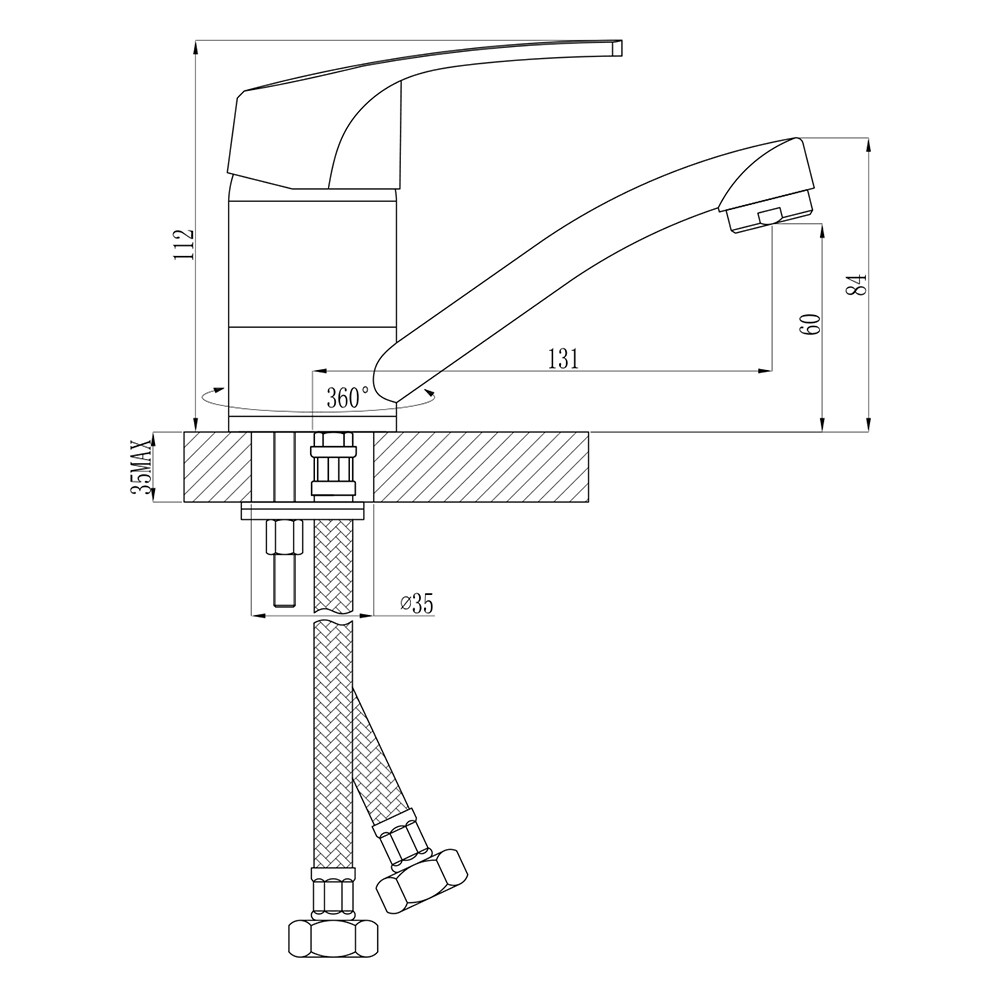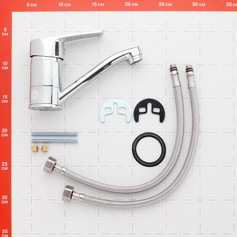 смеситель, пластиковый аэратор с функцией легкой очистки, керамический картридж 40 мм, гибкая подводка 35 см – 2 шт., универсальная присоединительная группа для горизонтального крепления (возможно крепление гайкой – в комплект не входит).