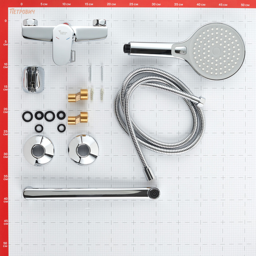Смеситель, монтажный набор, душевой шланг, ручная лейка, держатель, инструкция по эксплуатации с гарантийным талоном.