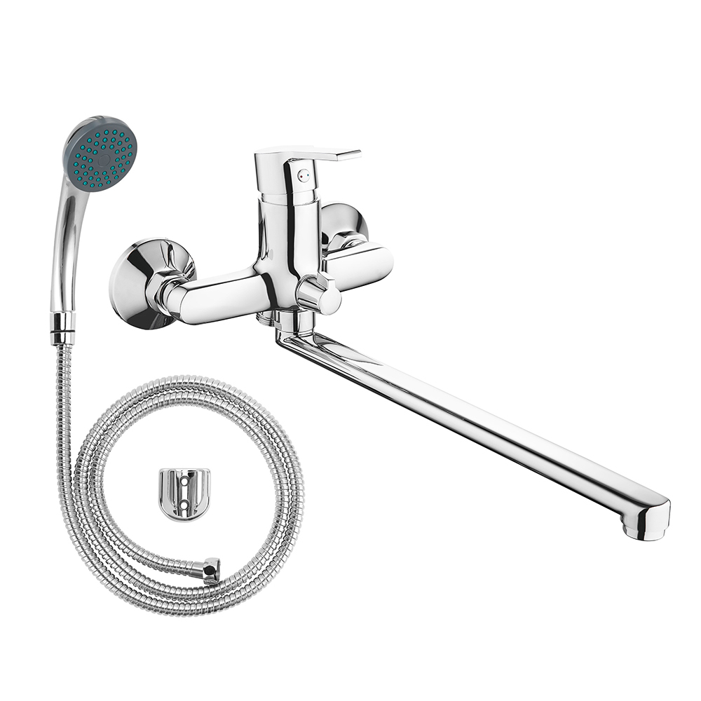 Смеситель для ванны с длинным изливом с аксессуарами изготовлен из безопасной для здоровья латуни. Латунный корпус устойчив к перепадам давления и температур, не подвержен коррозии.