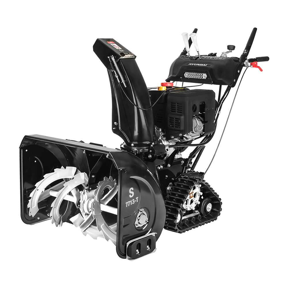Снегоуборщик бензиновый Hyundai S 7713-T — гусеничная самоходная машина с мощным зимним двигателем на 13 л.с. Оборудование имеет 2 задние и 6 передних скоростей, а также возможность изменения стороны и дальности выброса снега до 15 м. Двухступенчатая система зазубренных шнеков и широкий ковш 76,4×54 см защищены от деформаций.