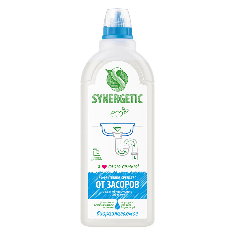 Концентрированное средство для устранения засоров Synergetic — высокоэффективное средство, подходящее для любых видов засоров и канализационных труб. Устраняет запахи и обладает дезинфицирующим эффектом, справляется с засорами даже в стоячей воде. Комплекс биоразлагаемых растительных А-тензидов и соды удаляет засоры всего за полчаса. Кальцинированная сода создает необходимую для растворения засора щелочную среду и быстро расщепляет масложировые компоненты. Биоразлагаемое средство не содержит хлора, ароматизаторов, красителей и агрессивных ПАВ, оно безопасно для всех видов труб и септических установок. Попадая в среду септика, средство понятно для микроорганизмов и без труда распадается на простые соединения.