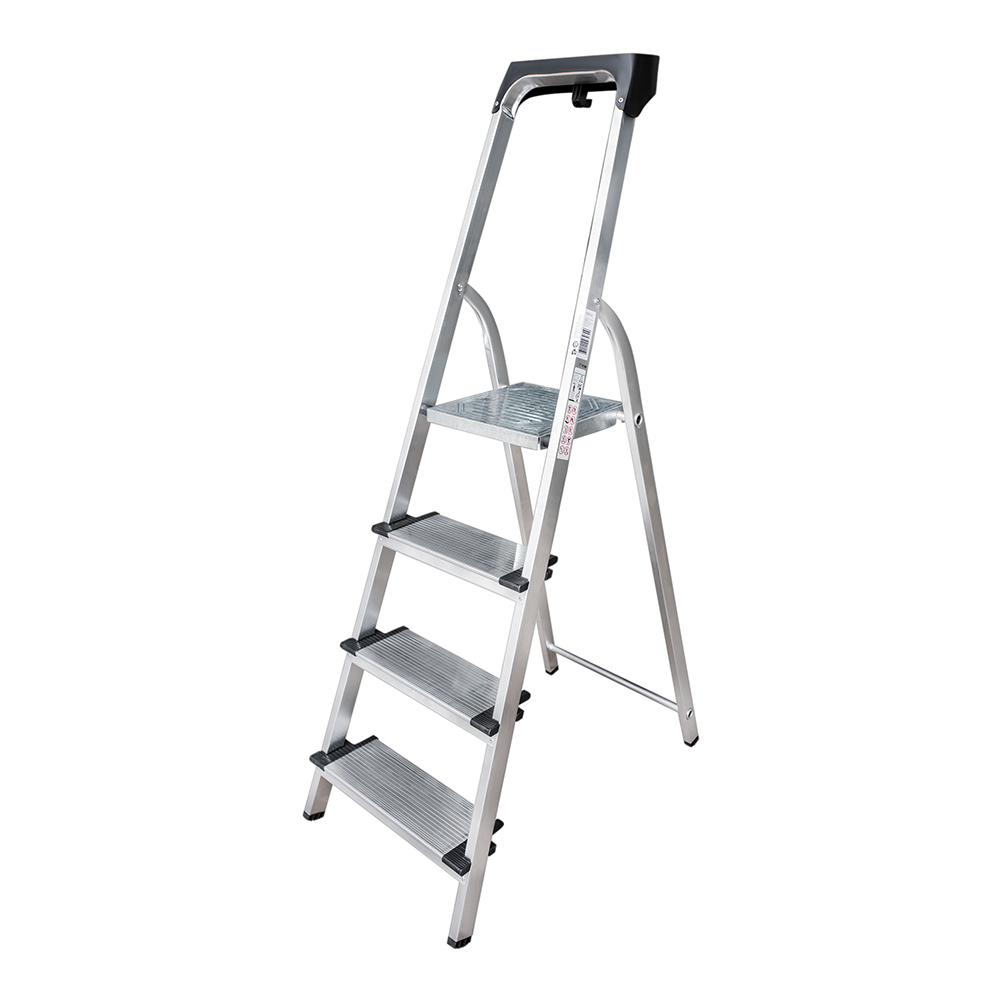 В основании стремянки прочная рама из алюминиевого профиля прямоугольного сечения. Пластиковые наконечники препятствуют скольжению, и обеспечивают отличную устойчивость. Многократное клепаное соединение ступеней с рамой обеспечивает исключительную надежность и безопасность при работе на стремянке. Имеет четыре ступени шириной 130 мм, что позволяет стопе комфортно размещаться на лестнице.