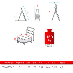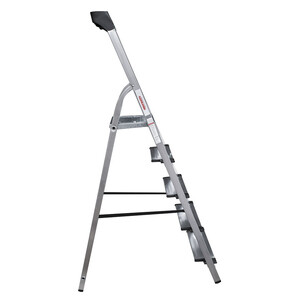 В основании стремянки прочная рама из алюминиевого профиля прямоугольного сечения. Пластиковые наконечники препятствуют скольжению, и обеспечивают отличную устойчивость. Многократное клепаное соединение ступеней с рамой обеспечивает исключительную надежность и безопасность при работе на стремянке. Имеет пять ступеней шириной 130 мм, что позволяет стопе комфортно размещаться на лестнице.