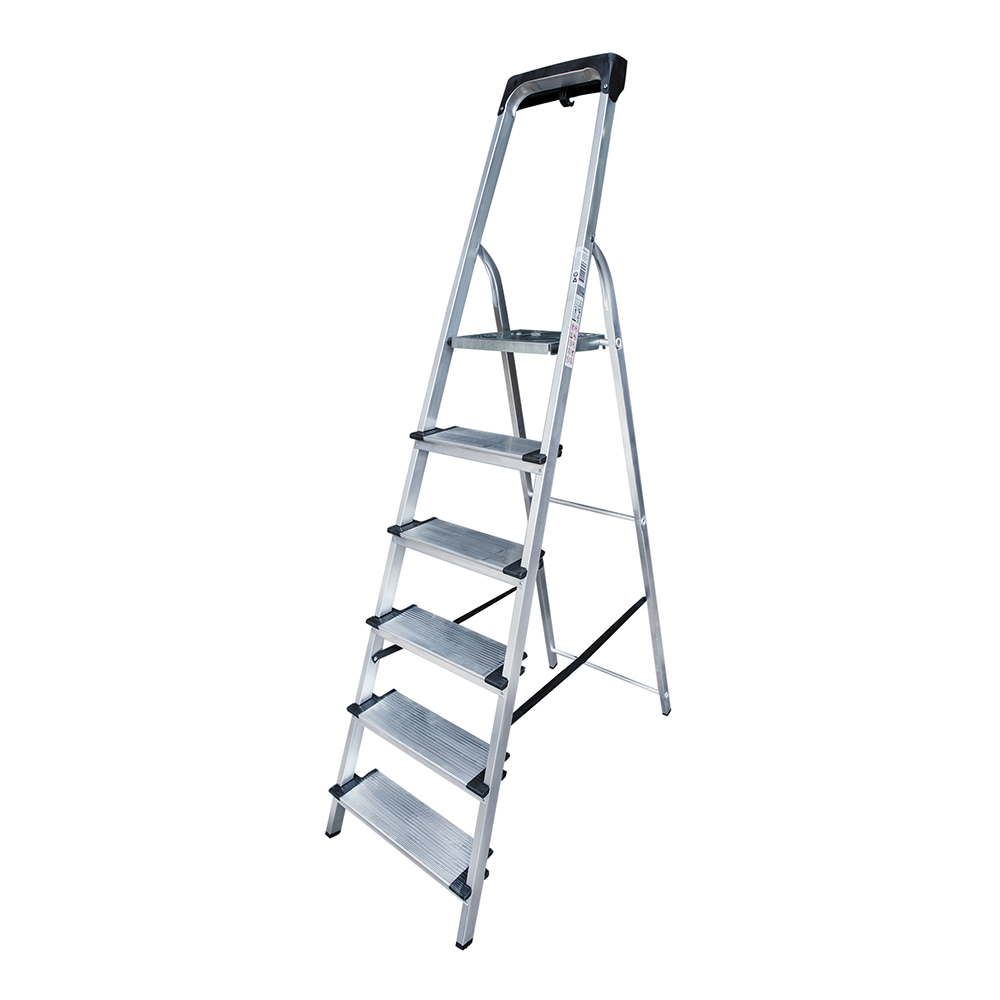 В основании стремянки прочная рама из алюминиевого профиля прямоугольного сечения. Пластиковые наконечники препятствуют скольжению, и обеспечивают отличную устойчивость. Многократное клепаное соединение ступеней с рамой обеспечивает исключительную надежность и безопасность при работе на стремянке. Имеет шесть ступеней шириной 130 мм, что позволяет стопе комфортно размещаться на лестнице.