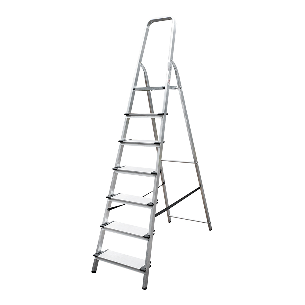 В основании стремянки прочная рама из алюминиевого профиля прямоугольного сечения. Пластиковые наконечники препятствуют скольжению, и обеспечивают отличную устойчивость. Многократное клепаное соединение ступеней с рамой обеспечивает исключительную надежность и безопасность при работе на стремянке. Имеет семь ступеней шириной 130 мм, что позволяет стопе комфортно размещаться на лестнице.