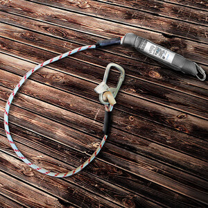 Страховочный строп из 24-х прядной полиамидной верёвки с малым монтажным карабином, винтовым соединительный карабином и амортизатором рывка.