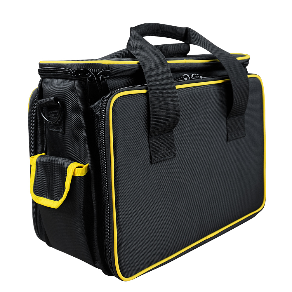 Предназначен для переноски и хранения инструментов, а также для ноутбука и планшета с диагональю 14 дюймов, и документов. Сумка изготовлена из ткани 1680 D Оксфорд с водоотталкивающим полиэфирным волокном, обладающей повышенной водонепроницаемостью и износостойкостью, а также простой в уходе. Удобство при переноске обеспечивается крепкими ручками и плечевым ремнем с мягким наплечником. Для оптимального размещения всех необходимых принадлежностей имеются 3 отделения, 2 наружных и 39 внутренних карманов.