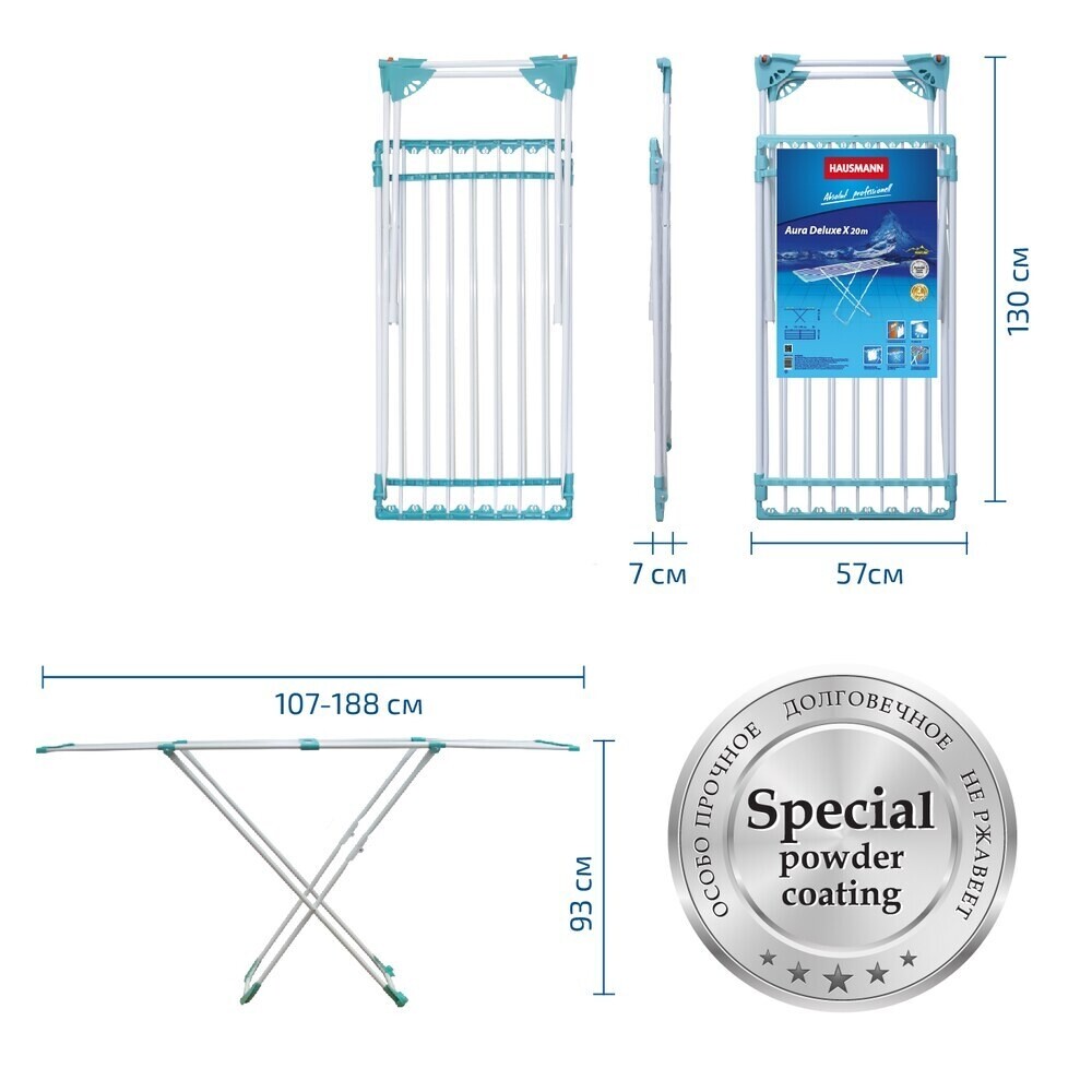 Напольная сушилка для белья AURA Deluxe X – это практичное решение для сушки белья дома. Конструктивная особенность сушилки позволяет установить подходящую длину прутьев с помощью телескопического сдвижения. Колесные опоры обеспечивают легкое передвижение сушилки по дому. Диаметр металлических прутьев позволяет сушить белье без заломов. Качественное порошковое окрашивание металлических элементов конструкции защищает от образования ржавчины. Полезная длина для навески белья 20 метров.