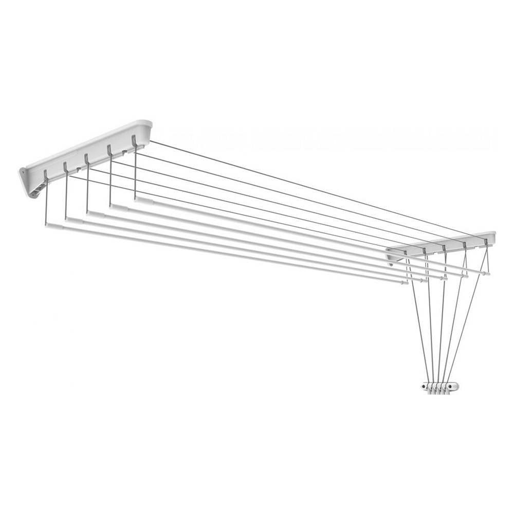 Сушилка для белья настенно-потолочная состоит из 5 сушильных прутьев длиной 1,8 м. Лифт-механизм опускает и поднимает сушильные прутья и облегчает развешивание белья.