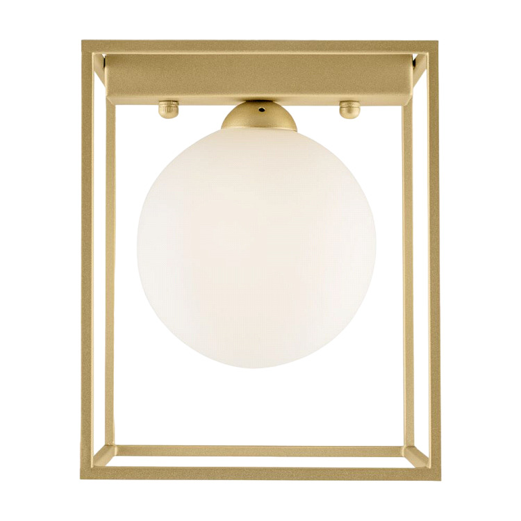 Стеклянный плафон матово-белого цвета контрастирует с металлической арматурой золотого оттенка. Компактные размеры светильника позволяют использовать его в небольших комнатах с низкими потолками. В серии также представлены люстры различной высоты на 3 и 1 плафон, а также настольная лампа. Лампы в комплект не входят.