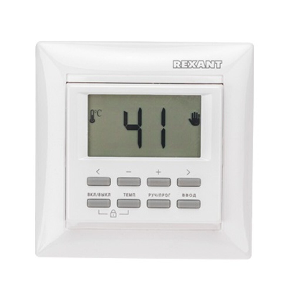Цифровой терморегулятор Rexant белого цвета предназначен для совместного использования с системами индивидуального электрического отопления: пленочными и кабельными теплыми полами, нагревательными матами, инфракрасными нагревателями и конвекторами без регулятора. Позволяет устанавливать комфортную температуру от +5 до +40 градусов в помещении и поддерживать ее, а также задавать временные интервалы включения и выключения. Возможно планирование до 6 событий в сутки на 7 дней вперед. Такой подход позволяет значительно снизить энергопотребление и затраты на него. Для удобства термостат снабжен кнопками управления, графическим дисплеем с подсветкой, функцией «часы» и «календарь». Точность срабатывания гарантируют сразу 2 термодатчика, которые контролируют температуру воздуха и пола (длина шнура выносного датчика 2,5 м). Терморегулятор совместим с электроустановочными средствами Legrand серии Valena.