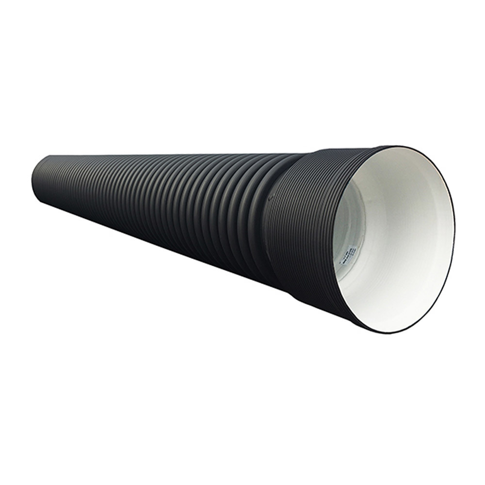 Труба имеет двуслойную структурированную стенку. Наружный слой — гофрированный, черного цвета, внутренний слой — гладкий, белого цвета.