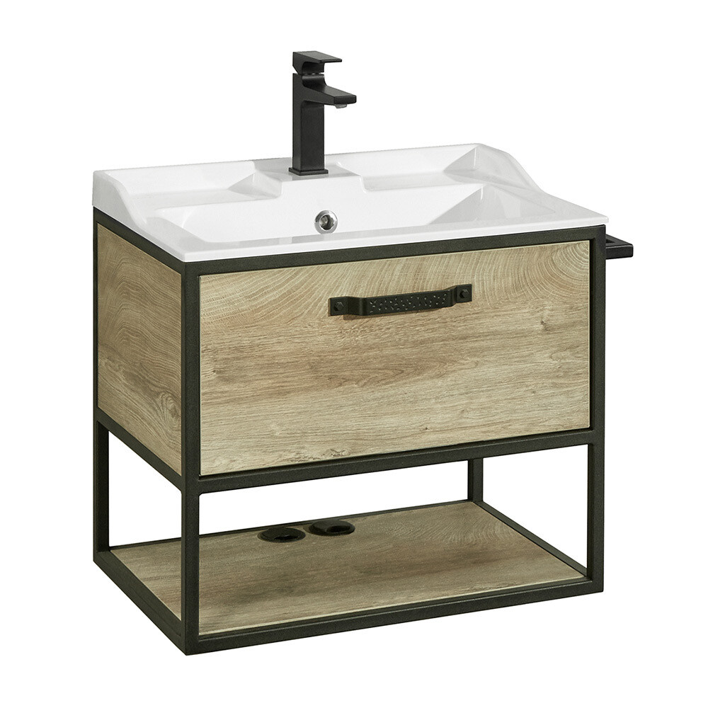 Тумба Лофт Фабрик 65 в цвете Дуб Эндгрейн – это сочетание натурального древесного декора и благородства металла. Удобный вместительный ящик, снабженный направляющими плавного выдвижения, и открытая нижняя полка позволят разместить все необходимое. Оригинальная ручка идеально сочетается с металлическими черными профилями и полотенцедержателем. Полотенцедержатель можно установить опционально по желанию клиента слева или справа.