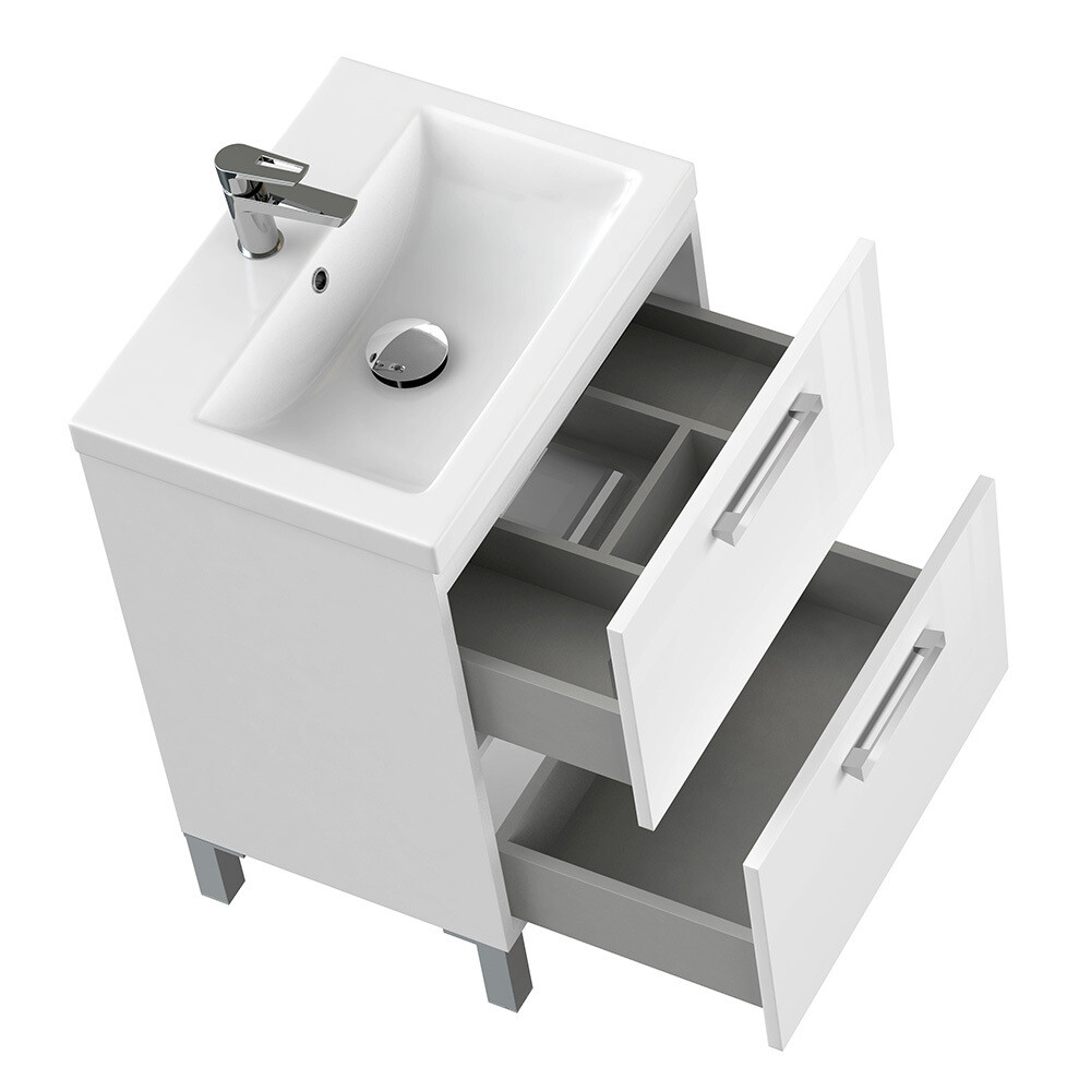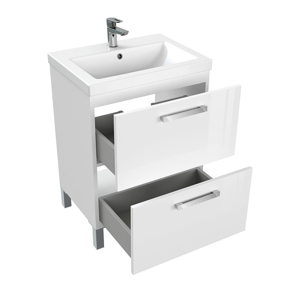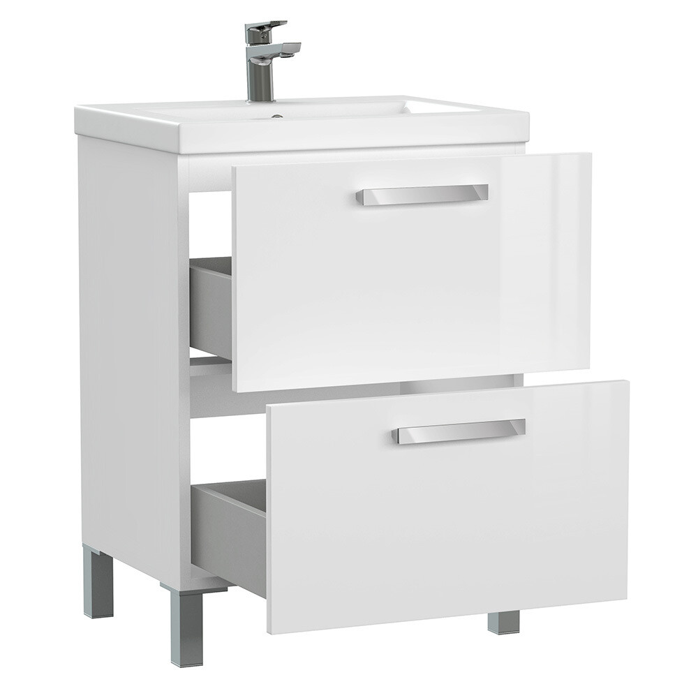Тумба под раковину Melar выполнена в не теряющем актуальности белом цвете. Гладкие глянцевые фасады ящиков дополнены хромированными ручками четкой геометрической формы. Скрытые направляющие ящиков снабжены доводчиками, что позволяет закрывать ящик мягко и бесшумно. Тумбу можно как подвешивать на стенку, так и устанавливать на ножки, что делает ее универсальным и функциональным решением для любой ванной комнаты.