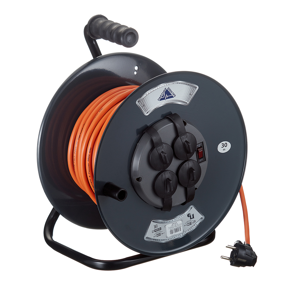 Удлинитель Партнер Электро с заземлением 30 м на катушке металл 3,5 кВт 4 розетки ПВС 3х1,5 кв.мм IP44