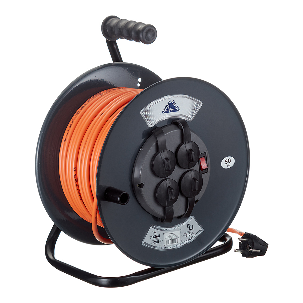 Удлинитель Партнер Электро с заземлением 50 м на катушке металл 3,5 кВт 4 розетки ПВС 3х1,5 кв.мм IP44