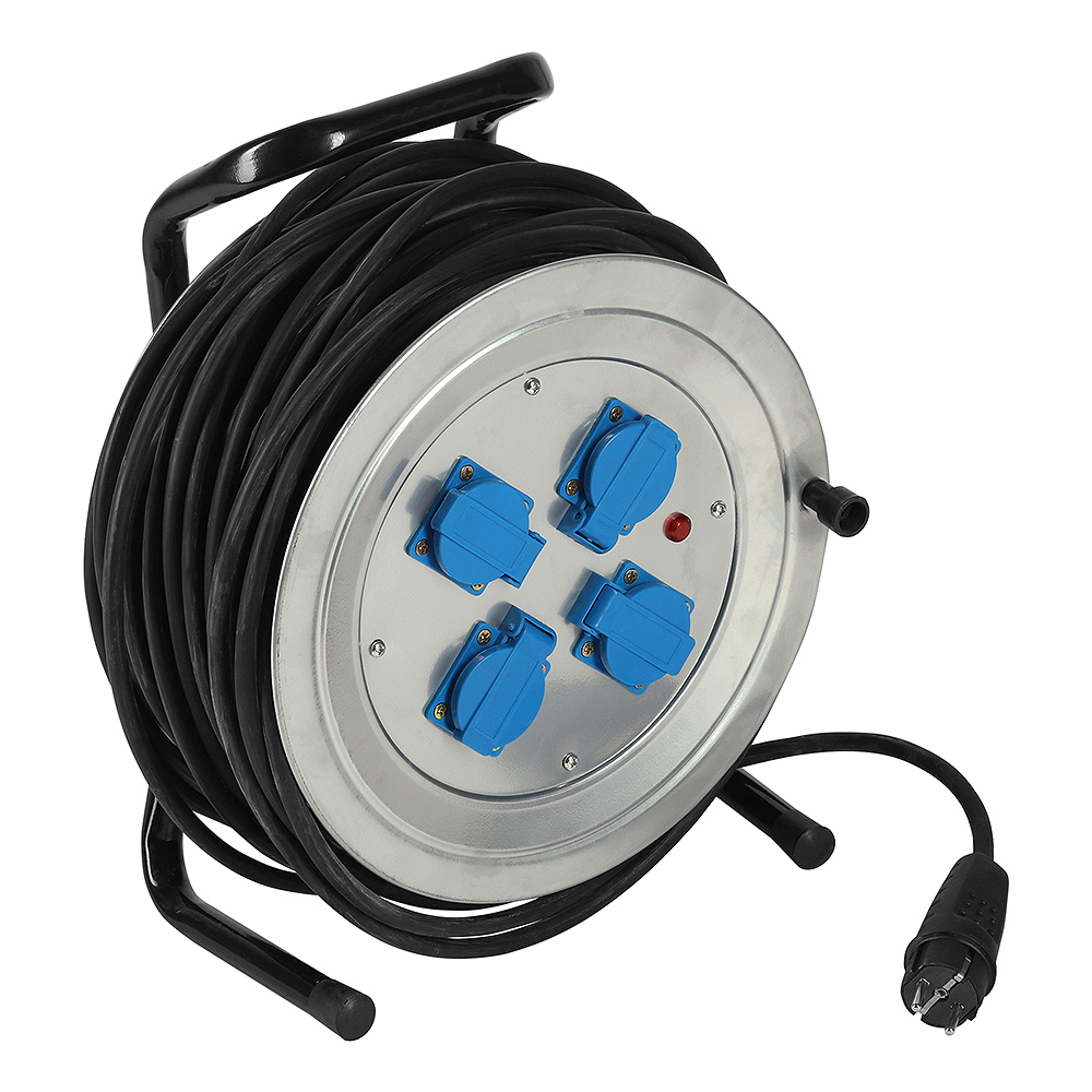Расшифровка маркировки: КГ 3х2,5 – марка кабеля, 4 розетки на катушке, 4000 Вт — мощность допустимой нагрузки на удлинитель, IP-44 — степень защиты, 50м – длина кабеля удлинителя.