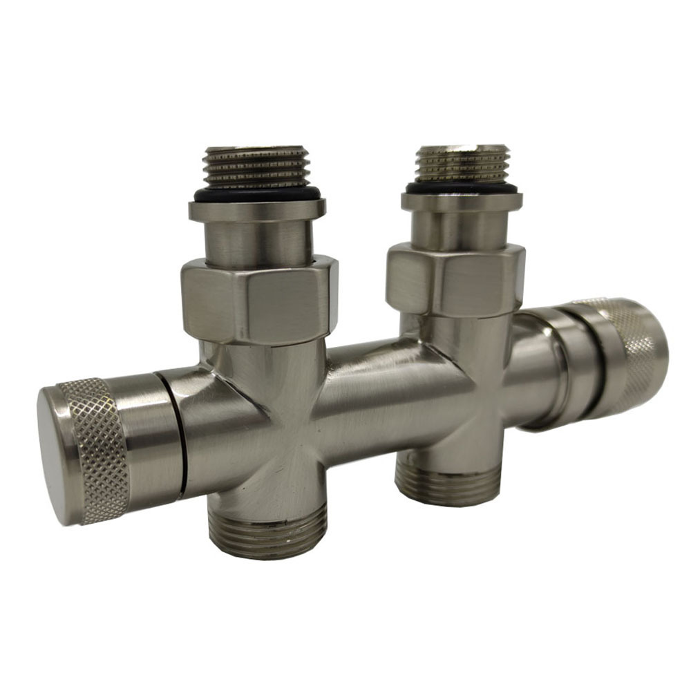 Узел SR Rubinetterie прямой для нижнего подключения радиаторов — вентиль на подачу ручной регулировки, преобразуемый в термостатический, с механизмом предварительной настройки и запорный клапан. Межосевое расстояние 50 мм, соединение для медных или многослойных труб, резьбовые переходники для подключения к радиатору с герметичной прокладкой.