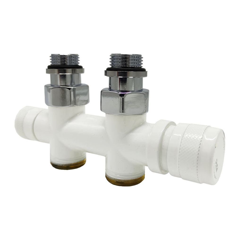 Узел SR Rubinetterie прямой для нижнего подключения радиаторов — вентиль на подачу ручной регулировки, преобразуемый в термостатический, с механизмом предварительной настройки и запорный клапан. Межосевое расстояние 50 мм, соединение для медных или многослойных труб, резьбовые переходники для подключения к радиатору с герметичной прокладкой.