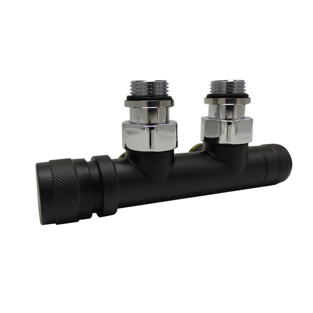 Узел SR Rubinetterie угловой для нижнего подключения радиаторов — вентиль на подачу ручной регулировки, преобразуемый в термостатический, с механизмом предварительной настройки и запорный клапан. Межосевое расстояние 50 мм, соединение для медных или многослойных труб, резьбовые переходники для подключения к радиатору с герметичной прокладкой.