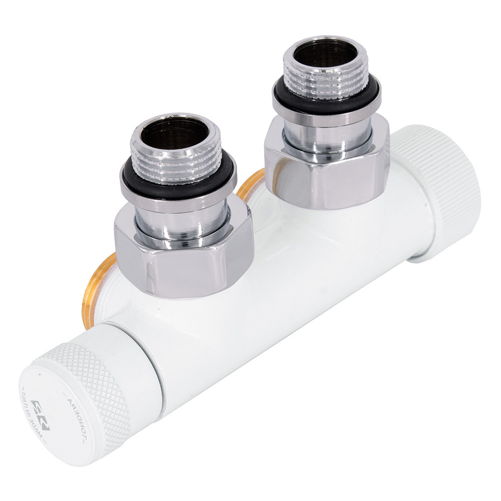 Узел SR Rubinetterie угловой для нижнего подключения радиаторов — вентиль на подачу термостатический, с механизмом предварительной настройки и запорный клапан. Межосевое расстояние 50 мм, соединение для медных труб или многослойных труб, резьбовые переходники для подключения к радиатору с герметичной прокладкой.