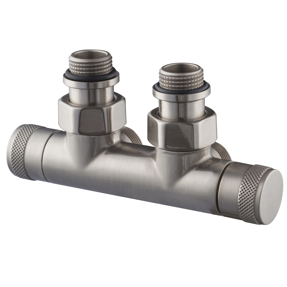 Узел SR Rubinetterie серии Tondera угловой для нижнего подключения радиаторов — двойной запорный клапан. Межосевое расстояние 50 мм, соединение для медных или многослойных труб, резьбовые переходники для подключения к радиатору с герметичной прокладкой.